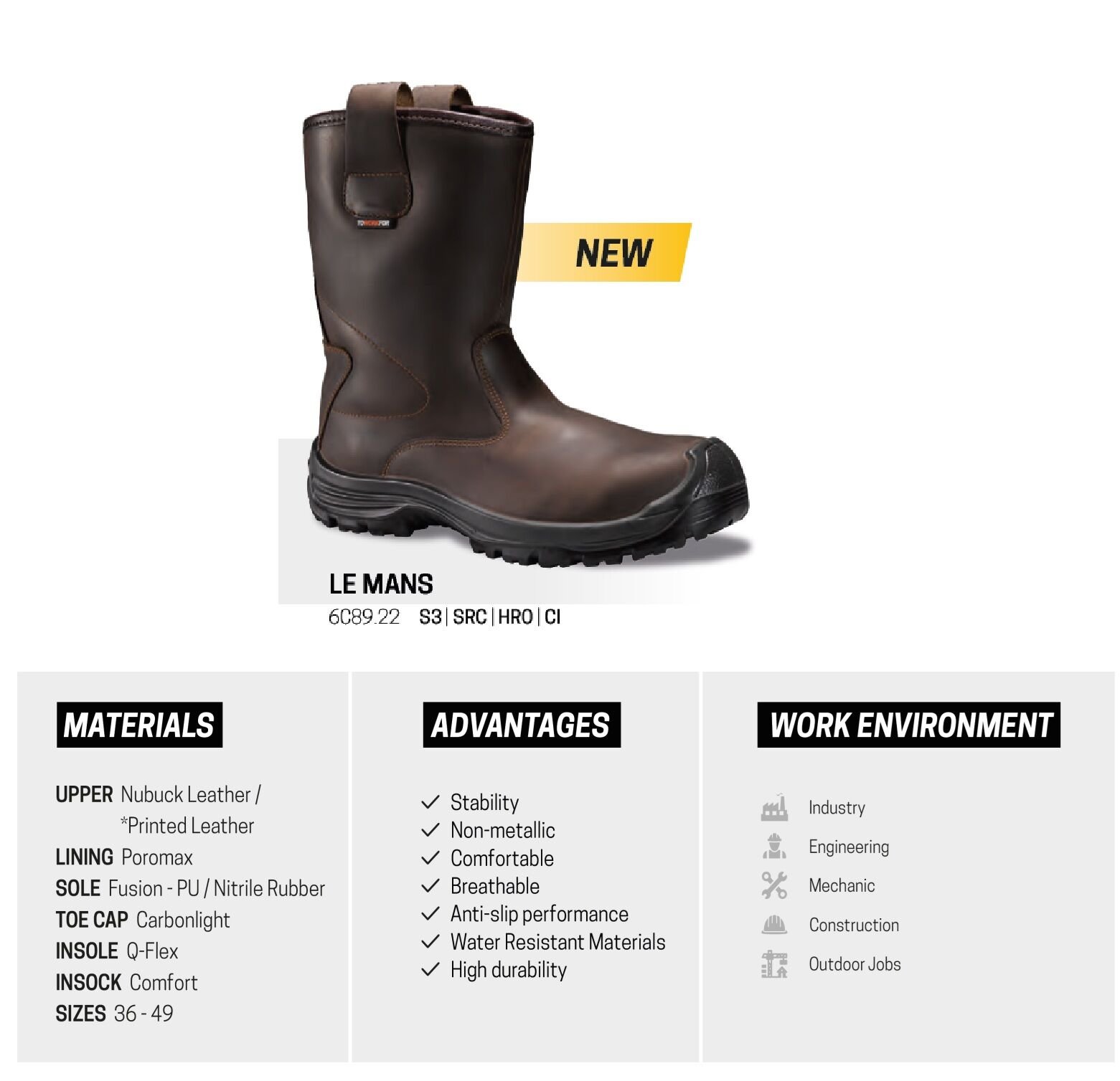 Bu iş botu S3, SRC ve HRO güvenlik standartlarına uygundur. Yani suya dayanıklı, kaymaz tabanlı, ısıya dayanıklı ve delinmeye karşı korumalıdır.