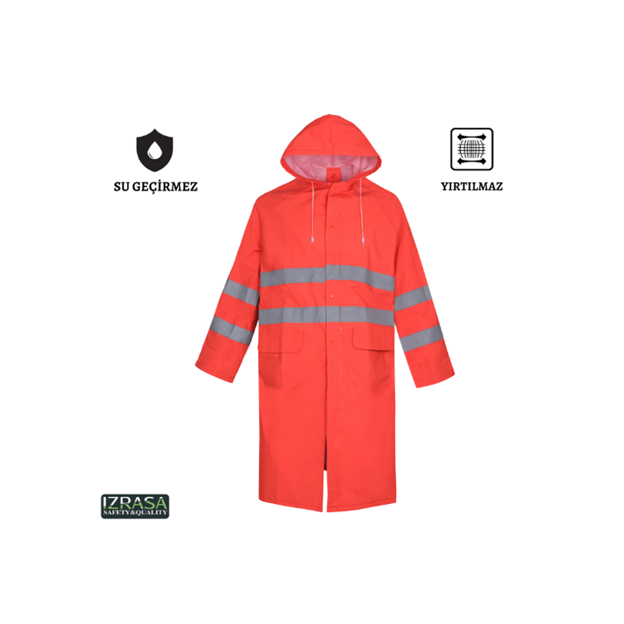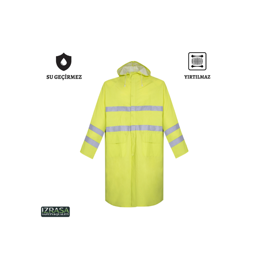 Zorlu hava koşullarında güvenli ve konforlu kullanım sağlayan IZRASA NM05 reflektörlü yağmurluk pardesü, 0,32 mm kalınlığındaki PVC polyester kumaşı ile dayanıklılık sunar. Astarlı yapısı sayesinde uzun süreli kullanımda rahatlık sağlar. 5 cm genişliğindeki reflektif şeritler ile görünürlüğü artırır, lastikli manşetler ve fermuar+çıtçıt detayları ile ekstra güvenlik sunar.