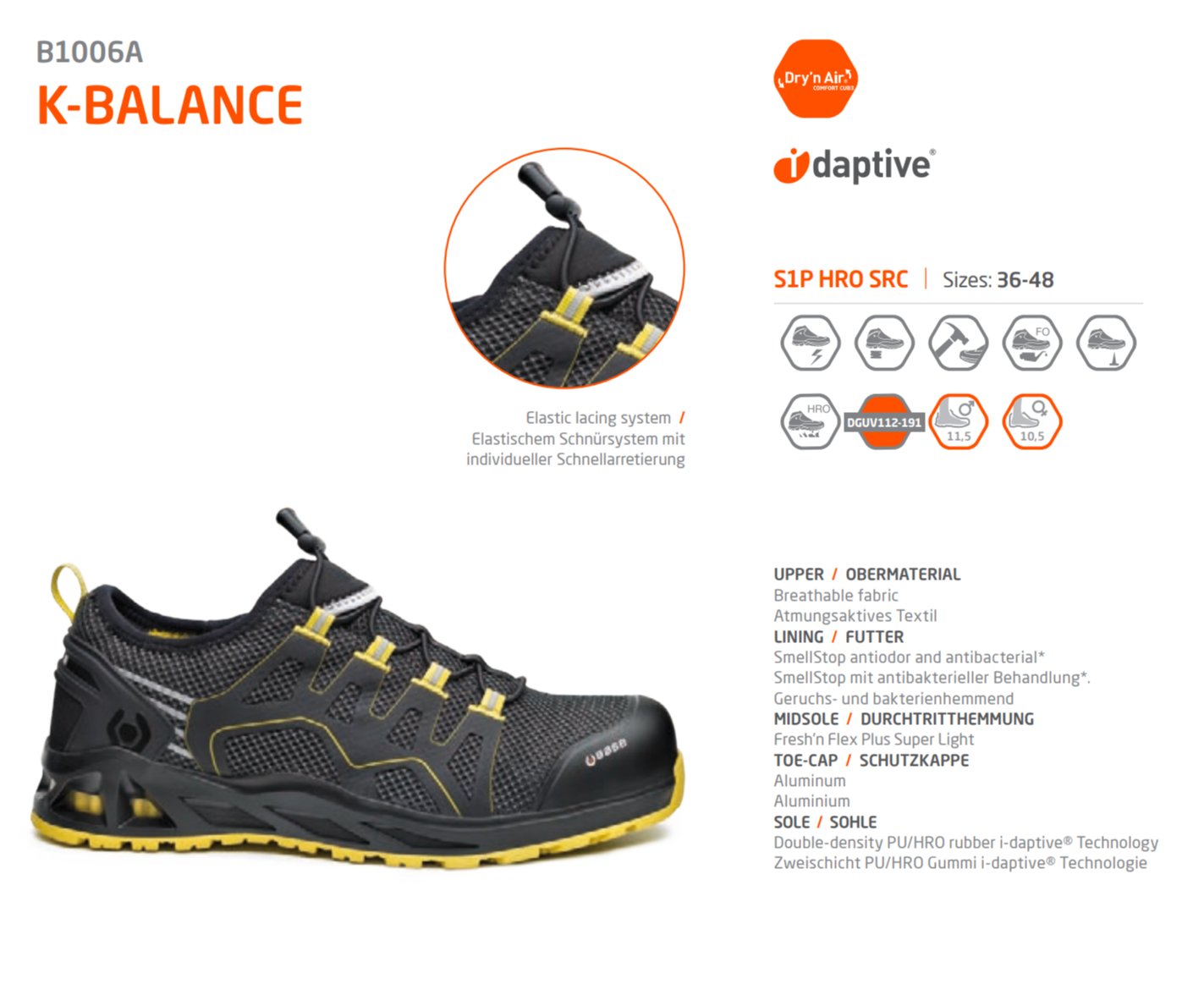 Base B1006A K-Balance S1P HRO SRC İş Ayakkabısı IDAPTIV Teknolojisi: Kullanıldığı ortama uyum sağlayan ve iyi bir duruş sağlayan şık ve modern bir güvenlik botu. Suya Dayanıklılık: Su geçirmez özelliği ile ayaklarınızı her koşulda kuru tutar. Hafif Alüminyum Burun: Parmaklarınızı darbelere karşı korur ve iş kazalarına karşı önlem alır. SmellStop Teknolojisi: Kalıcı anti-bakteriyel kumaş astarı ile kötü kokuları engeller. B1006A