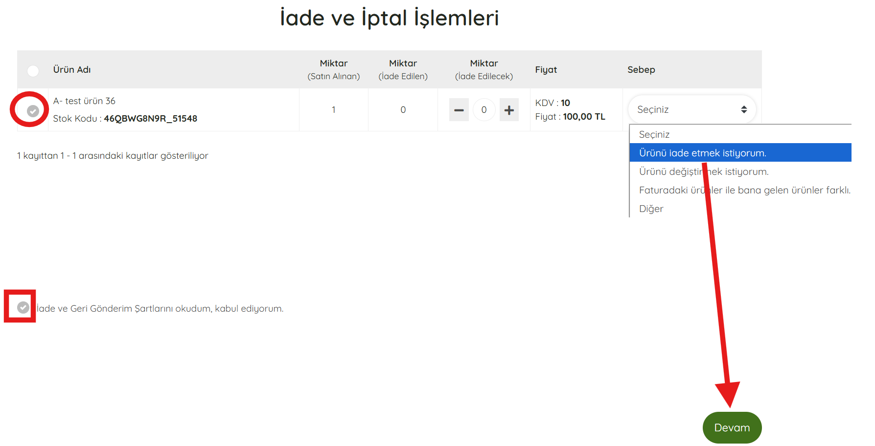 Adımları takip ederek ürünü neden iade etmek istediğinizi belirtin.