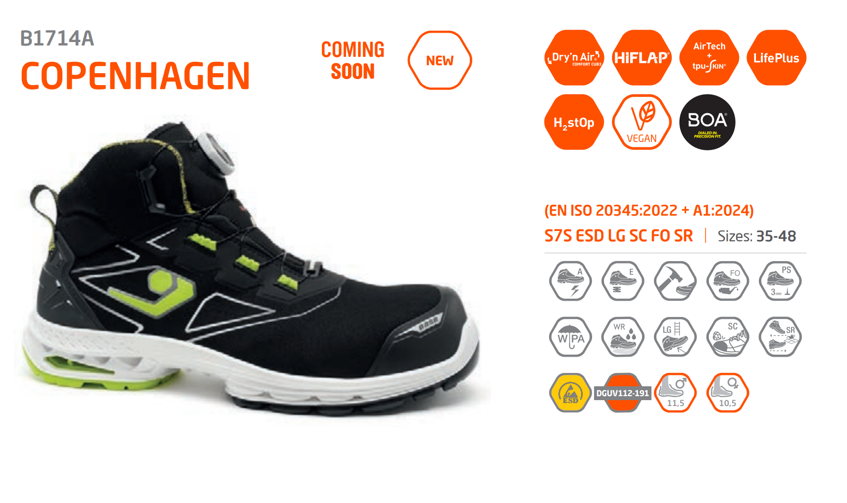 - Kompozit Burun Koruyucu: 200 J enerji darbesine dayanıklı, **metal içermeyen** yapısıyla hafiflik ve konfor sağlar.