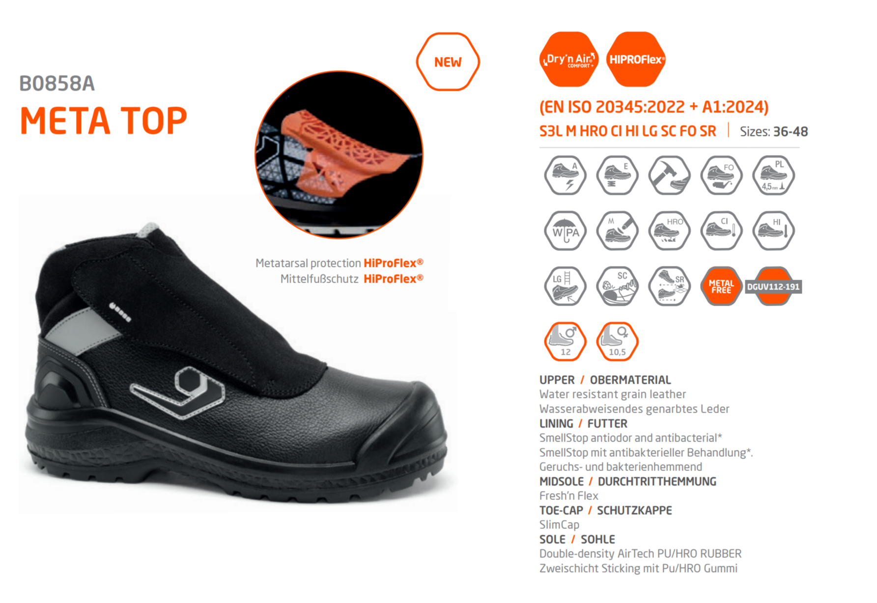 B0858A botu, ayaklarınızın hem mekanik hem de termal tehlikelere karşı en üst düzeyde korunmasını sağlamak için tasarlanmıştır: