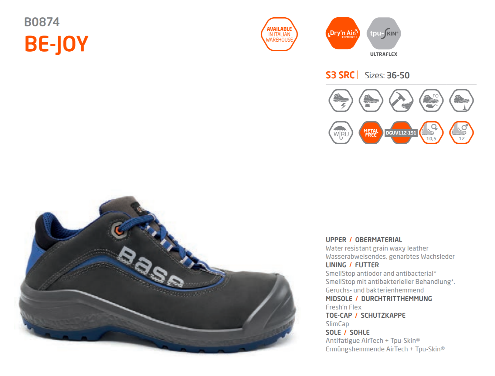 Base B0874 BE-JOY S3 SRC iş ayakkabısı, sunduğu üstün koruma özellikleri, konforlu yapısı ve patentli teknolojileri sayesinde elektrikçiler için ideal bir seçenektir. Bu ayakkabı, hem iş güvenliğini en üst düzeye çıkarır hem de çalışanlara gün boyu konforlu bir kullanım deneyimi sunar.