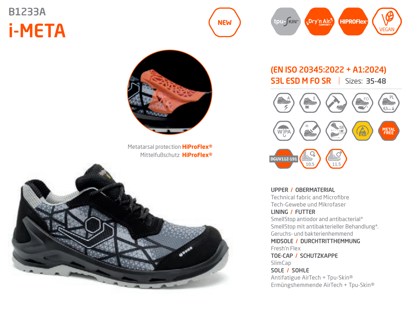 - Kompozit Burun Koruyucu: 200 J enerji darbesine dayanıklı, **metal içermeyen** ve hafiftir.