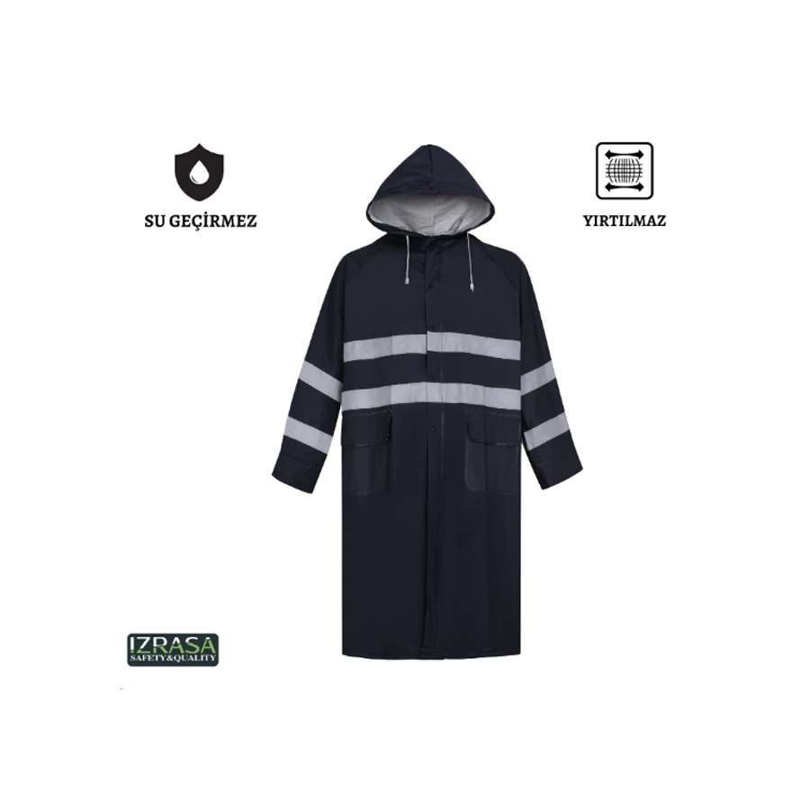 Zorlu hava koşullarında güvenli ve konforlu kullanım sağlayan IZRASA NM05 reflektörlü yağmurluk pardesü, 0,32 mm kalınlığındaki PVC polyester kumaşı ile dayanıklılık sunar. Astarlı yapısı sayesinde uzun süreli kullanımda rahatlık sağlar. 5 cm genişliğindeki reflektif şeritler ile görünürlüğü artırır, lastikli manşetler ve fermuar+çıtçıt detayları ile ekstra güvenlik sunar.